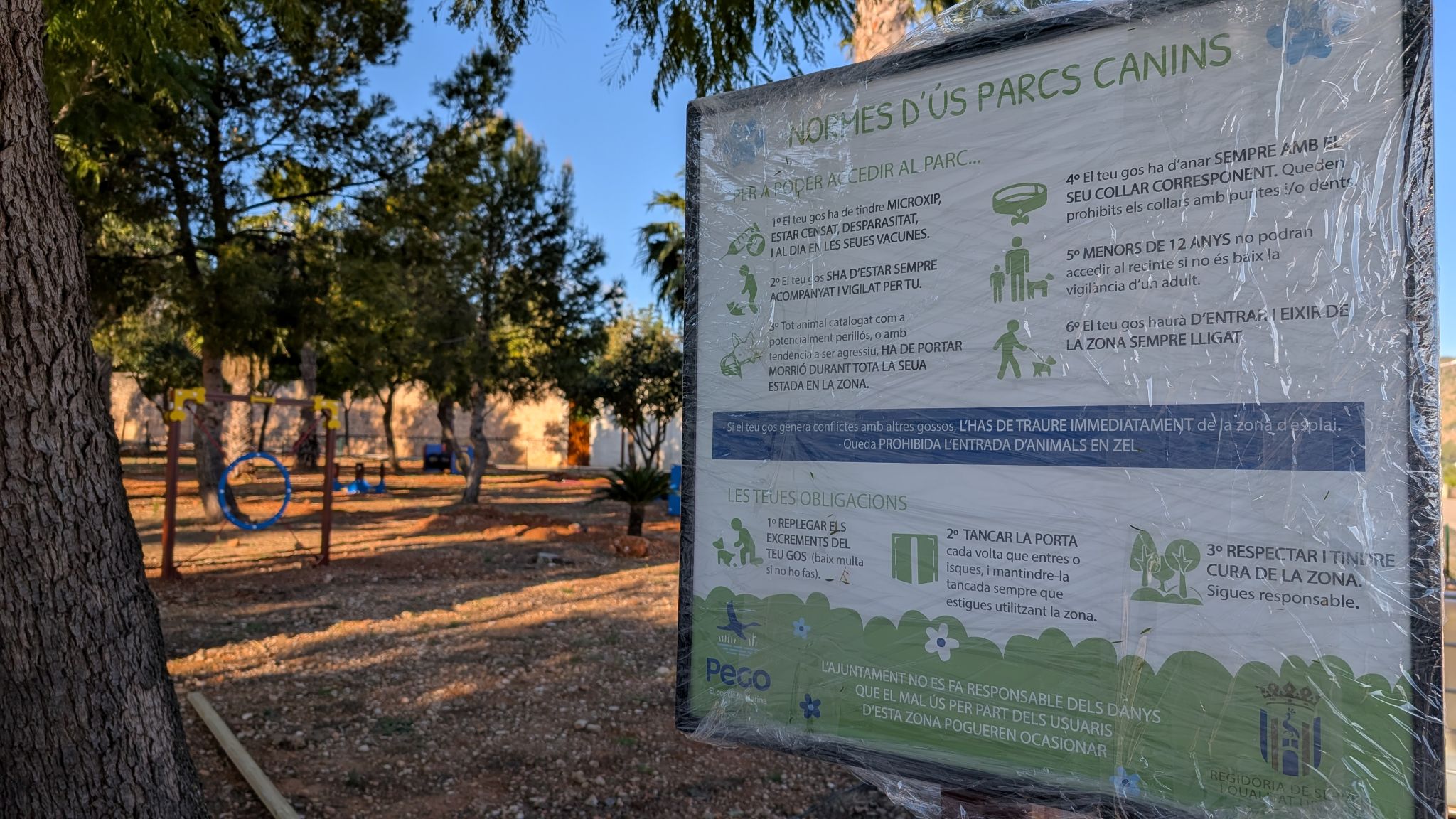 Februar 20 von 2026 - 14: 42 früher3 der 3Siehe Originalartikel: Pego eröffnet einen neuen Hundepark, in dem Haustiere im Freien spielen können. Ein Element des Agility-Parcours ist eine Holzrampe zur Bewegung und Stimulation der Hunde. Gesamtansicht des Hundeauslaufgebiets, ein eingezäuntes und bewaldetes Areal mit verschiedenen Spielgeräten für Haustiere. Ein Schild mit den Nutzungsregeln für den neuen Hundeauslauf in Pego wurde am Eingang des Geländes angebracht.