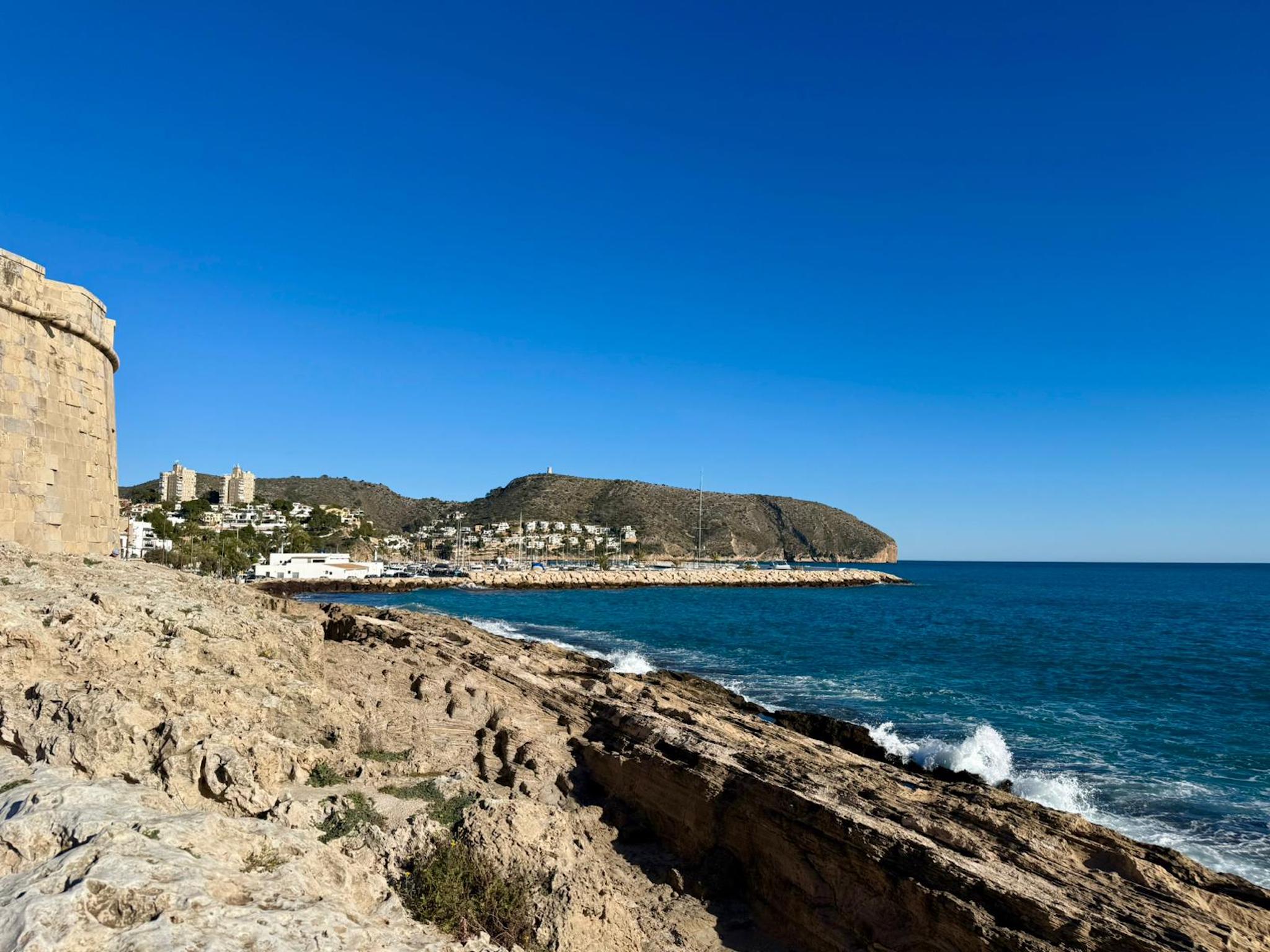 Februar 23 von 2026 - 14: 37 1 der 1Siehe Originalartikel: Teulada-Moraira erhält die Auszeichnung „Blauer Weg 2026“ für seine emblematische geologische Route Blick auf die Küstenlandschaft von Teulada Moraira entlang der Geologischen Route, mit den Felsformationen im Vordergrund und dem Castell de Moraira und dem Hafen im Hintergrund.